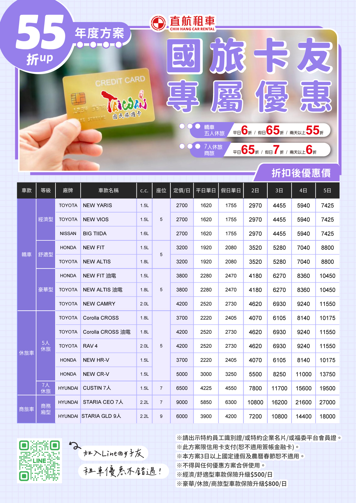 承租人須符合直航租車承租條件並遵守相關營業規定,直航租車保留是否提供租賃車輛之最終權利,租金定價依直航租車官網為基準。