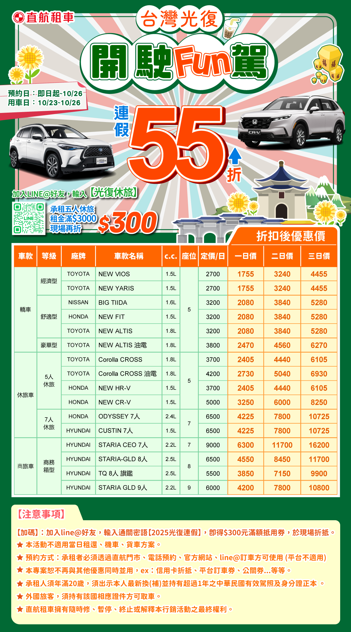 ※加碼:加入line@好友,輸入關鍵字【光復休旅】;五人休旅車款租金滿$3000現折$300 (使用期間:10/23~10/26)。