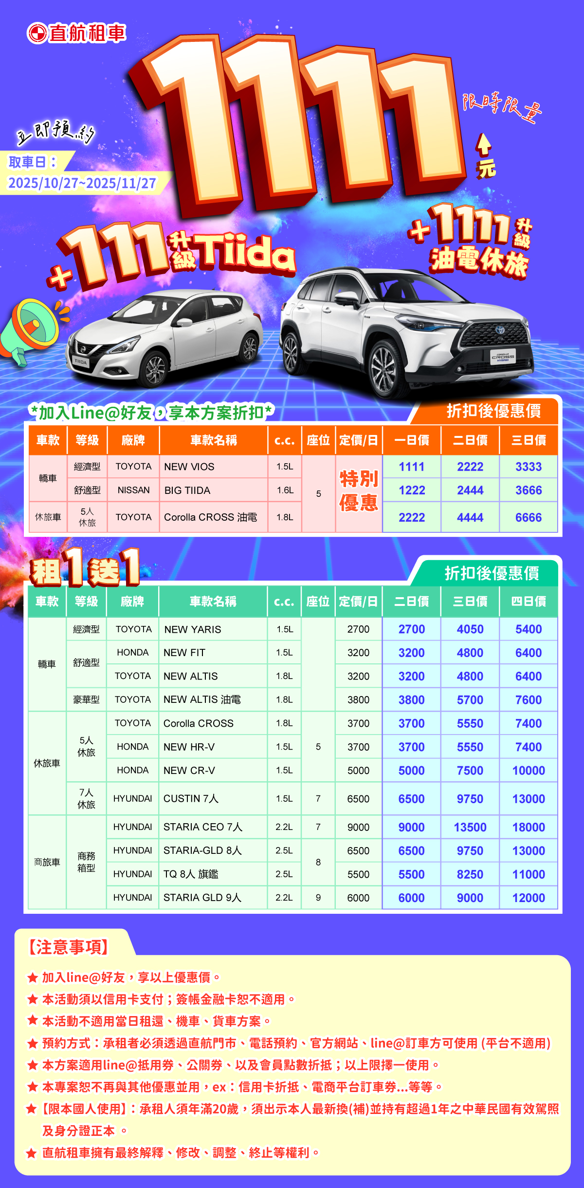升級BIG TIIDA只要再加$111/日、升級CC油電休旅只要再加$1111/日。