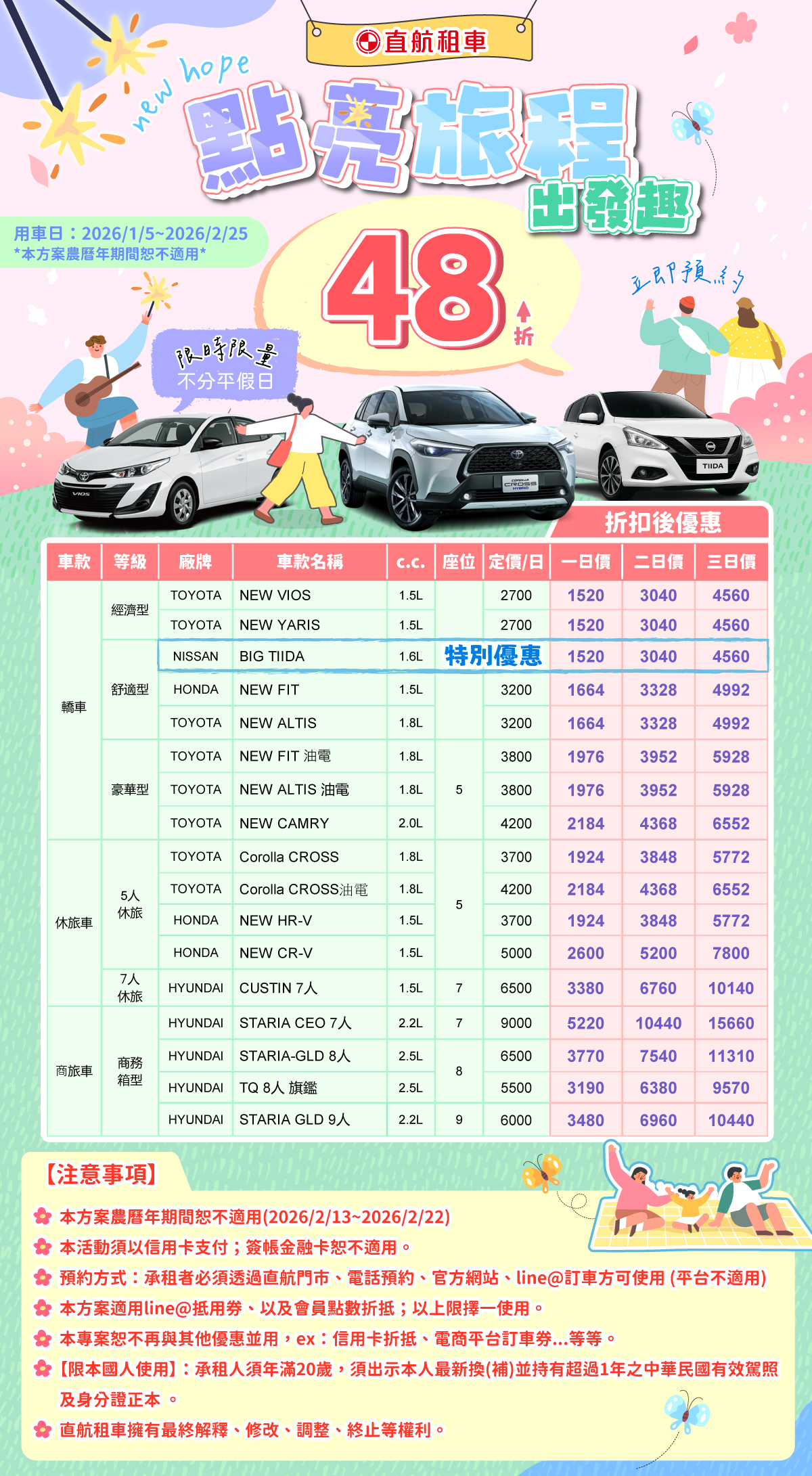• 承租人須符合直航租車承租條件並遵守相關營業規定,直航租車保留是否提供租賃車輛之最終權利,租金定價依直航租車官網為基準。