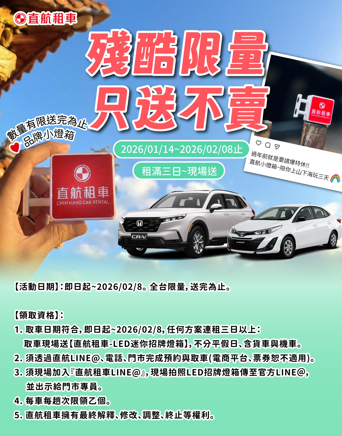 1.取車日期符合,即日起~2026/02/8,任何方案連租三日以上,取車現場送【直航租車-LED迷你招牌燈箱】,不分平假日、含貨車與機車,送完為止。