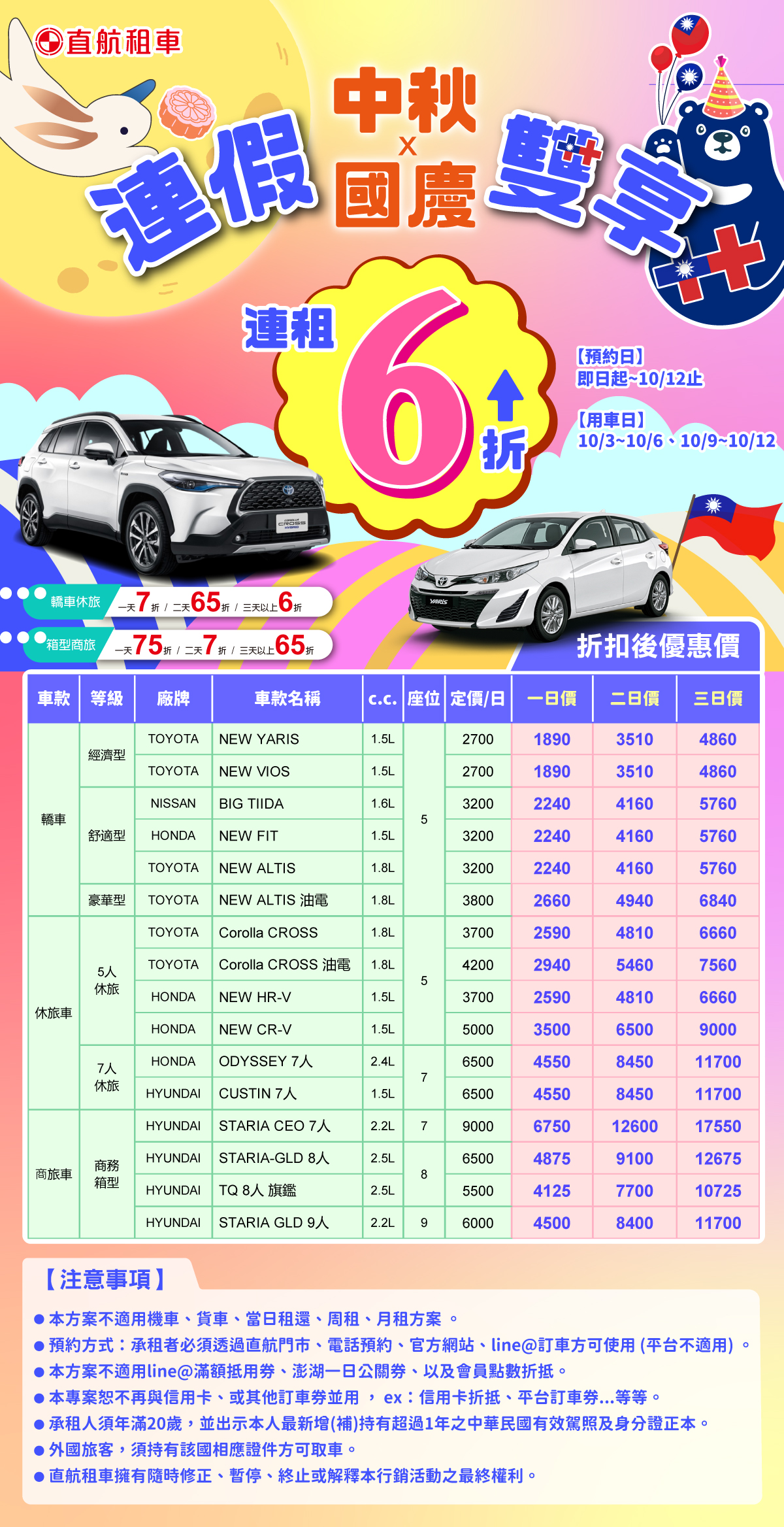 |用車日期|【中秋10/03~10/06】、【雙十10/09~10/12】。